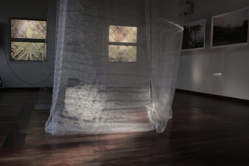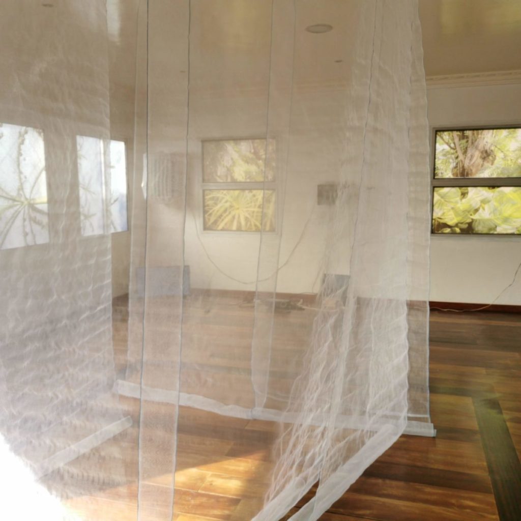 Installation : Photographies sur bâches et transparents / polaroids / ventilateurs / moustiquaires / projection vidéo / enregistrements sonores / Travaux des stagiaires